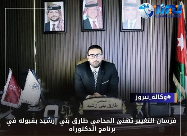 جمعية فرسان التغيير تهنئ المحامي والمستشار القانوني طارق بني إرشيد بقبوله في برنامج الدكتوراه في القانون الخاص في جامعة مؤته