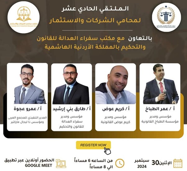 استكمالاً للرحلة في نشر الثقافة القانونية وفي ضوء بروتوكول التعاون الدولي مع مكتب سفراء العدالة للقانون والتحكيم بالمملكة الأردنية الهاشمية تم عقد الملتقى الحادي عشر وكان ذلك يوم الإثنين الموافق 30 سبتمبر 2024 الساعة 6م بتوقيت القاهرة اون لاين .